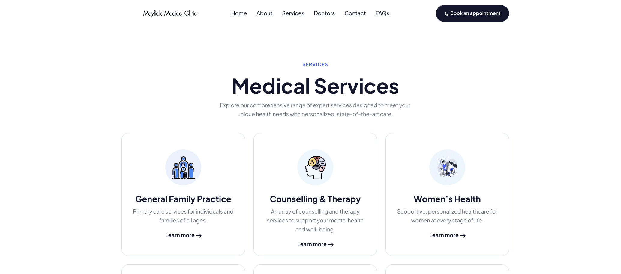We provided professional photography at the clinic to build trust and authenticity online. Our visuals highlight Mayfield’s team, clinic environment, and services, delivering a polished, approachable brand identity across the entire website.